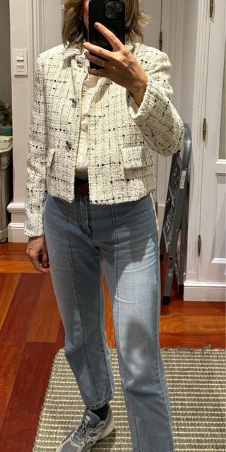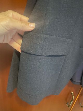 Elegante chaqueta de vestir con un toque brillante. Precio negociable, talla Xs-S - Diseño de corte clásico. - Acabado con pequeños destellos dorados. - Bolsillos frontales decorativos con detalle de botón.