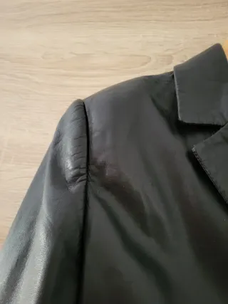 Chaqueta estilo motero de polipiel. - Cierre de cremallera frontal. - Bolsillos con cremallera. - Cuello muy deteriorado , con solapas y botones a presión. Tuve el mismo problema con otra chaqueta y se le puso un parque reparador