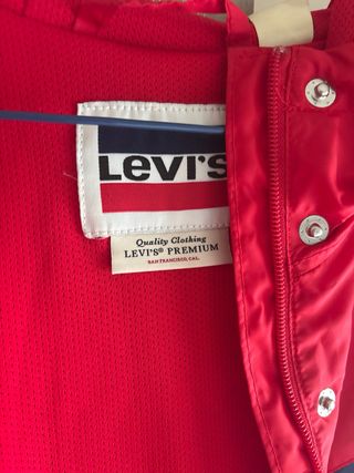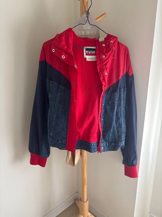 Chaqueta Levi's con un diseño moderno y llamativo. - Combinación de colores rojo, azul marino y denim. - Cierre de botones a presión. - Capucha integrada. - Puños y cintura elásticos.