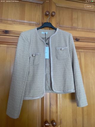 Chaqueta de Stradivarius en color beige, con un corte entallado. - Cierre de dos botones. - Bolsillos frontales con detalle. - Forro interior intacto - No se aprecia el coñor pero es mas clara