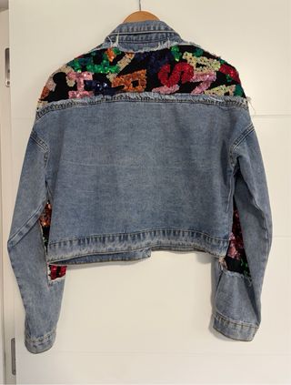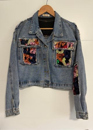 Chaqueta de mujer, talla XL. Manga larga. Nueva, sin estrenar y con etiqueta. Negra con detalles, brillos y lentejuelas de color plateado, dorado y marrón. Con flecos y borlones en el bajo. Cierre de botones. Con 4 bolsillos. Composición: 100% algodón. Tela tipo vaquera al tacto. Marca Mosnova. Más cosas en mi perfil Ropa entretiempo otoño primavera cazadora abrigo sobrecamisa