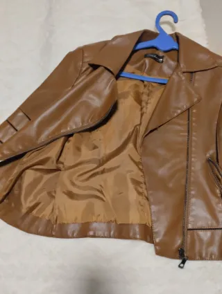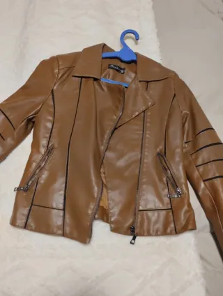 Chaqueta de efecto piel en color marrón, con un diseño moderno y detalles en negro.una sola puesta. En perfecto estado - Cierre de cremallera. - Bolsillos frontales con cremallera. - Puños con cremallera. - Costuras decorativas.