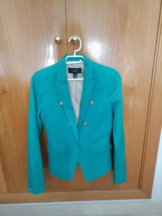 Chaqueta de Mango en color verde azulado. - Diseño de doble botonadura. - Dos bolsillos frontales. - Forro interior. - Detalle de botones dorados.