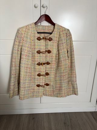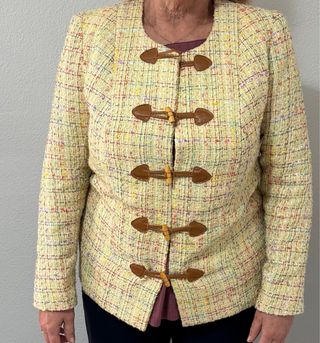 Chaqueta de señora con un diseño vibrante y alegre. - Tejido de tweed con hilos de colores. - Cierre frontal con detalles de cuero y madera. - Cuello redondo.