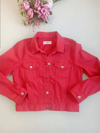 Cazadora de corte vaquero clasico con bolsillos, en color rojo, cierra con botones. Marca Mango, talla M Impecable