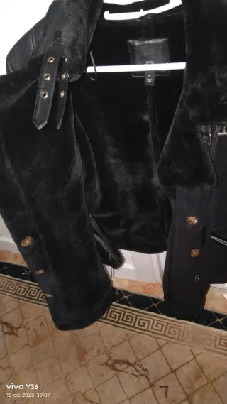 Chaqueta de efecto piel con forro interior de pelo.esta mal tallada pone talla S pero es como una L - Cuello con solapas y detalle de hebilla. - Cierre de cremallera asimétrico. - Bolsillos laterales con cremallera. - Puños y bajo con acabado de pelo.