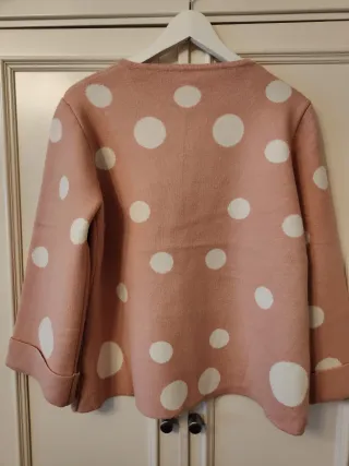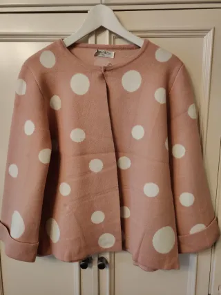 Chaqueta de punto con un alegre estampado de lunares. - Diseño de lunares blancos sobre fondo rosa. - Corte abierto. - Mangas tres cuartos con vuelta.