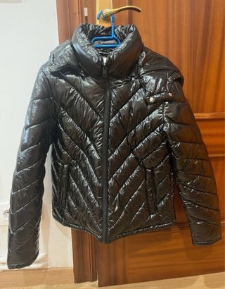 Chaqueta acolchada con un llamativo acabado efecto charol. - Diseño acolchado. - Cierre de cremallera. - Cuello alto. - Capucha