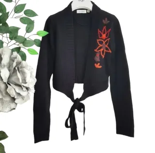 Chaqueta Crop negra de punto, con bordados de flores, talla S válida tambien para M, de New Saks. De sisa a sisa desde 44 cm. (Cede), largo 40. 100% acrílico. En perfecto estado.