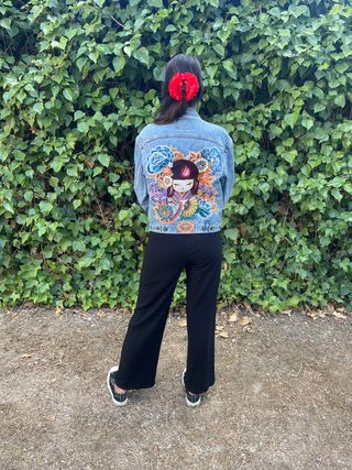 Chaqueta vaquera, con jacquard en la espalda, que representa a una geisha. Talla 16 (equiv. L) Marca: Pepe Orgaz