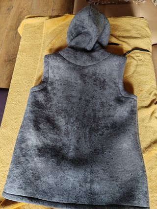 Chaqueta/abrigo, sin mangas con capucha fija, color gris, no sé material exacto pero tipo elástico y muy agradable al tacto, talla 40. Nunca puesto (fue un regalo, pero me queda pequeña). En perfecto estado.