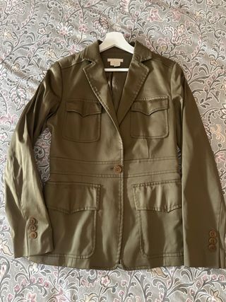 Chaqueta de estilo militar en tono verde oliva. Un básico versátil para cualquier armario. - Cierre de botones. - Dos bolsillos frontales con solapa. - Detalle de cinturón en la cintura. - Puños ajustables con botón.