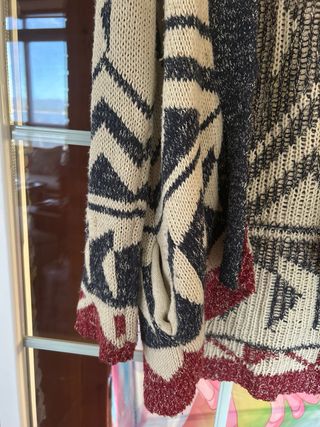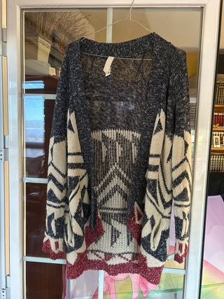 Preciosa chaqueta de punto en tonos azules y beige. Es una prenda cálida y cómoda, ideal para los días más frescos. - Diseño de punto con patrón geométrico. - Manga larga. - Cierre abierto.
