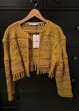 Chaqueta corta de Zara con un diseño de macramé muy especial. Es una prenda llamativa y con mucho estilo. - Diseño de macramé intrincado. - Corte corto. - Acabado con flecos en el bajo.