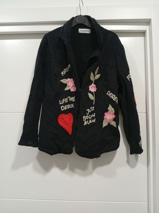Chaqueta militar, con cabeza de tigre en la espalda. Tejido floral cosido en las hombreras. Talla L