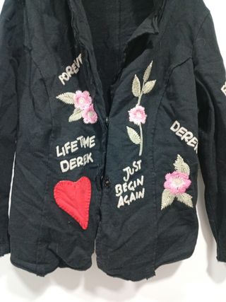 Chaqueta vaquera con un diseño único y llamativo de la marca Desigual - Mangas de lana con estampado de aves y flores. - Detalles bordados en la parte delantera. - Bajo con banda decorativa. - Sin bolsillos laterales solo los delanteros del pecho Paso las medidas de la chaqueta porque la talla creo recordar que era una M pero corté lo de dentro y no recuerdo bien la talla Puesta tres veces