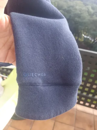 Chaqueta híbrida de la marca Quechua, en color azul. Ideal para actividades al aire libre. - Diseño con cremallera frontal. - Capucha integrada. - Mangas largas. Ideal combinación de plumas y forro polar ,es súper abrigada. Falta el cordón de la capucha
