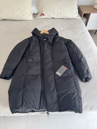 Chaqueta acolchada de color negro con capucha. - Diseño largo y moderno. - Cierre de cremallera frontal. - Bolsillos prácticos.