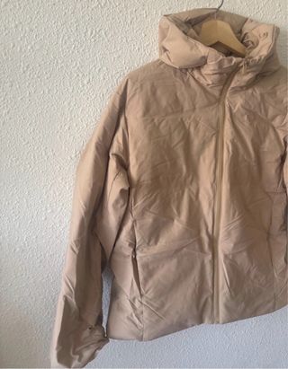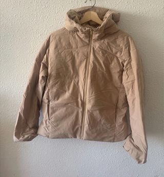 Chaqueta larga de Zara en color beige. Es una prenda acolchada con capucha y detalles de cremalleras. - Diseño acolchado. - Capucha con pelo sintético. - Bolsillos frontales con cremallera.