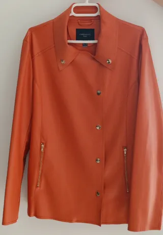 Chaqueta de efecto piel con un llamativo color naranja. Presenta un diseño moderno y versátil. - Cierre de botones. - Bolsillos laterales con cremallera dorada. - Cuello camisero. - Detalle de pespuntes. - Sirve para M/L.