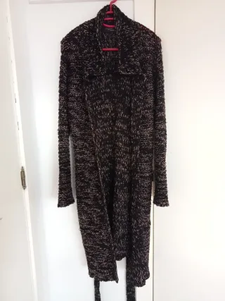 Chaqueta larga de punto con un diseño jaspeado en tonos oscuros y claros. Presenta un cuello amplio y una cinturón para anudar. - Diseño de punto. - Cuello envolvente. - Cinturón a juego.