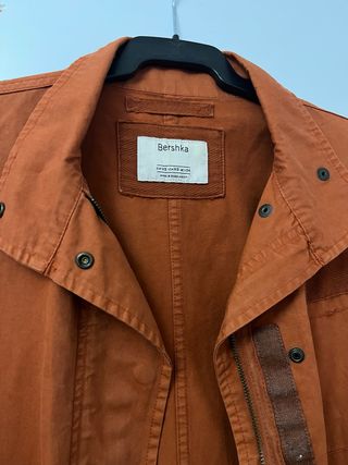 Chaqueta de color naranja de la marca Bershka. - Talla XS (34/6). GRANDE. - Cierre de cremallera y botones. - Cuello alto con solapas.