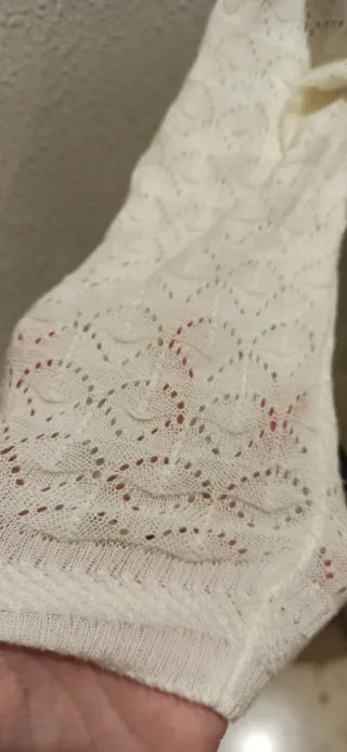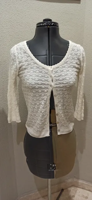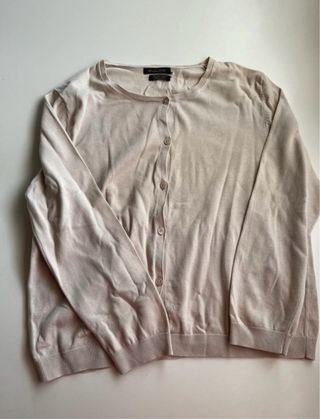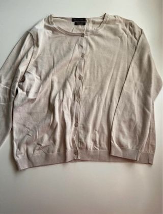 Chaqueta de punto fina de Massimo Dutti en color beige. - Cuello redondo. - Cierre de botones. - Puños y bajo de canalé. Es talla M pero es como una S. En las ultimas fotos pueden verse una manchas en la espalda pero no son llamativas.