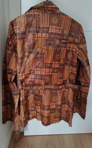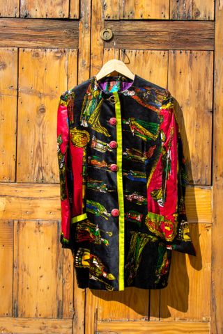 Espectacular chaqueta de diseño vanguardista con estampado lujoso que parece inspirado en Versace, parece sacado de un tapiz histórico, presenta figuras eclesiásticas/reales en tonos de rojo, verde, amarillo y azul, de seda, en perfectas condiciones. Se puede enviar o recoger en Tienda Solidaria Piel de Mariposa MADRID C/Embajadores 35 (+ info en la última foto)