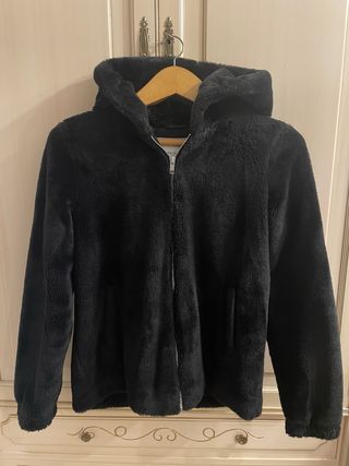 Chaqueta negra con capucha, confeccionada en un material suave y cálido. - Cierre de cremallera. - Dos bolsillos frontales. - Capucha integrada.