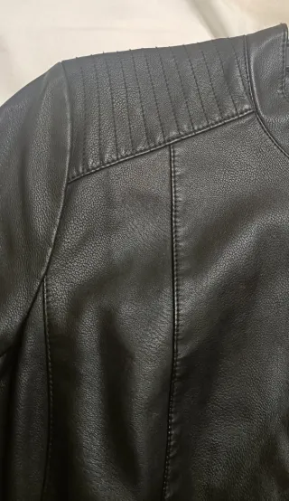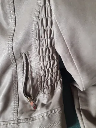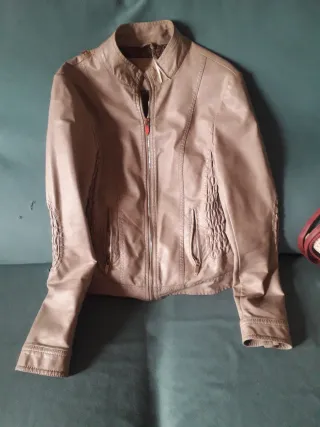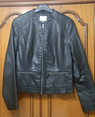 Cazadora de polipiel para mujer, talla L - Diseño con cuello redondo y corchete de cierre. - Cremallera frontal. - Bolsillos y puños con cremallera. - Detalle fruncido en codos y hombreras.