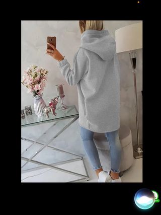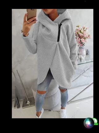 Chaqueta moderna con un diseño asimétrico y cremallera. - Talla L/XL. - Color gris jaspeado. - Capucha integrada. - Corte holgado.