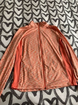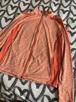 Chaqueta deportiva con un diseño moderno y llamativo. - Cremallera frontal naranja. - Bolsillos con cremallera en el pecho. - Ribetes naranjas en mangas y cuello. - Puños y cintura elásticos.