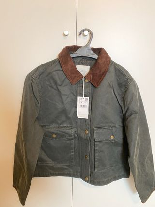 Chaqueta Barbour NUEVA Talla M con etiquetas de la marca springfield. Chaqueta corta con cuello camisero, bolsillos delanteros y cierre con cremallera. Con detalle de pana en cuello y puños. Si quieres mas fotos, te puedo mandar.