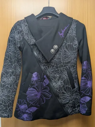 Chaqueta con un diseño original y llamativo. - Estampado floral blanco y morado. - Cierre asimétrico con cremallera. - Cuello alto con solapa. - Dos botones decorativos en la solapa. Hace función de cazadora de entre tiempo es gruesa