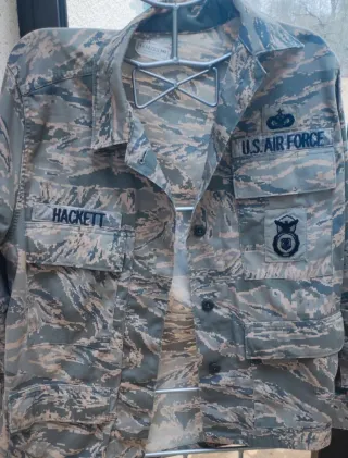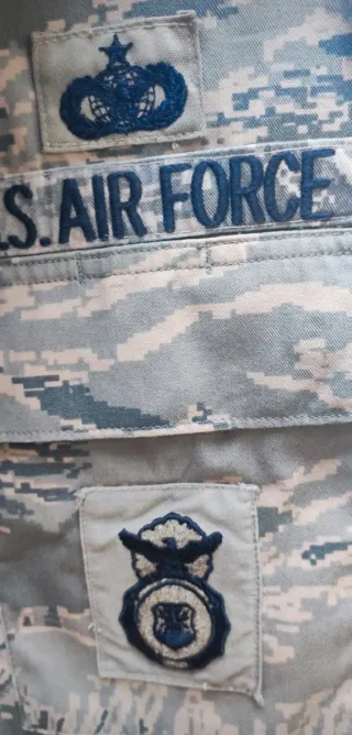 Chaqueta de camuflaje de la U.S. Air Force. Con parches y distintivos. En muy buen estado. Talla XL mujer Talla L hombre - Diseño de camuflaje digital. - Cierre de botones (a la izq.) - Dos bolsillos en el pecho. - Dos bolsillos inferiores.