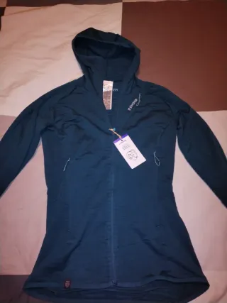 Chaqueta de lana merina para mujer, ideal para alpinismo. - Color verde azulado. - Cierre completo con cremallera. - Capucha integrada. - Bolsillos laterales con cremallera.