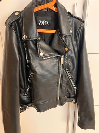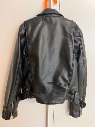 Chaqueta estilo motero con acabado en efecto piel. - Cierre de cremallera frontal. - Bolsillos laterales con cremallera. - Solapas de muesca. - Hebillas en los laterales inferiores.