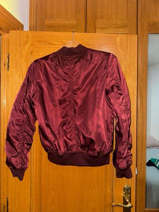 Chaqueta estilo bomber con un acabado satinado y un vibrante tono rojo. - Diseño moderno con cuello redondo. - Cremallera frontal. - Puños y bajo elásticos. - Mangas abullonadas con detalle fruncido.
