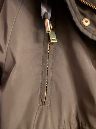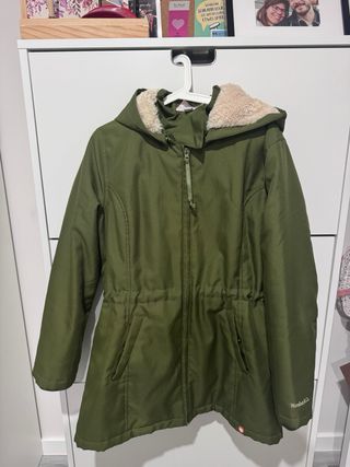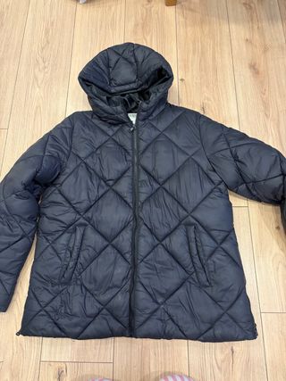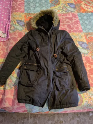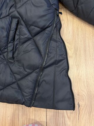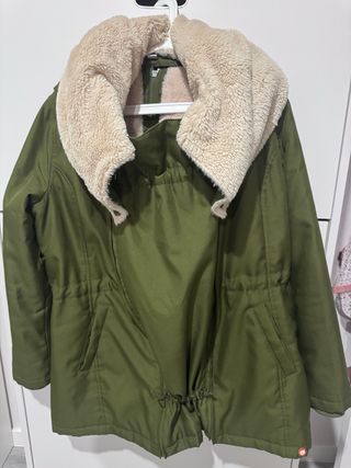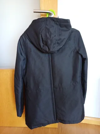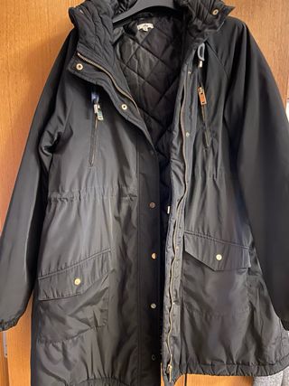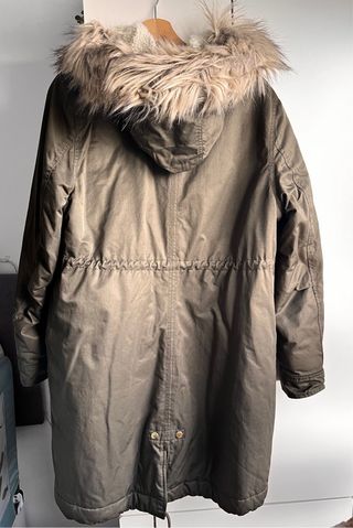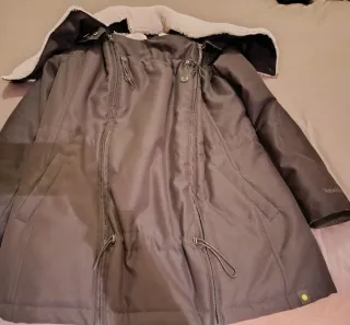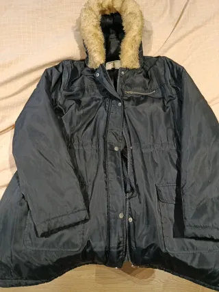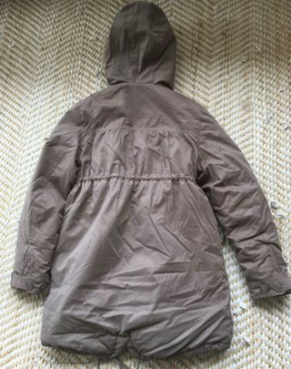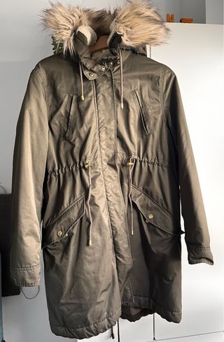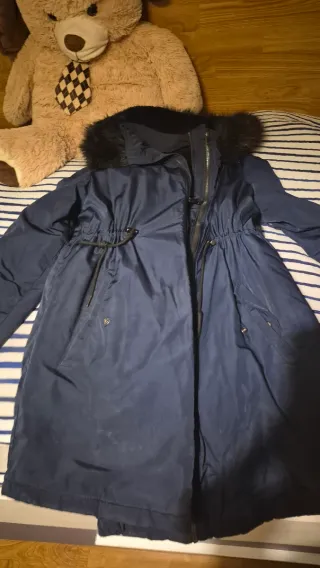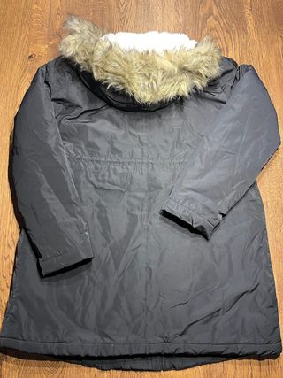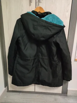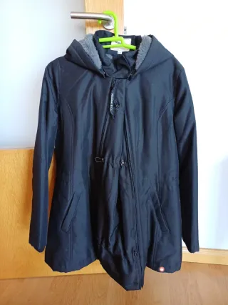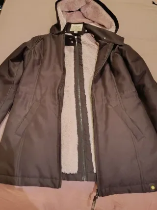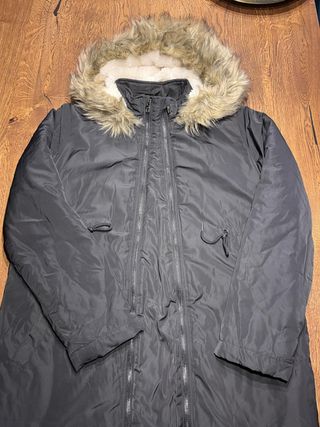 Abrigo diseñado para premamás, con un estilo moderno y funcional. - Capucha con detalle de pelo. - Cierre de cremallera. - Bolsillos laterales con botón. - Cordón ajustable en la cintura. - Con una pieza para hacer más grande el abrigo - Talla 44 - Marca Kiabi Como nuevo.