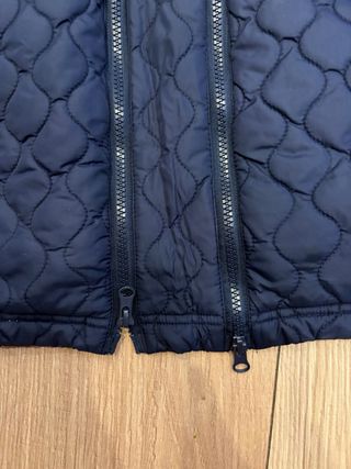 Chaqueta premamá de color azul marino Talla XS de la marca H&M. Diseño acolchado con capucha de pelo sintético. Bolsillos con cremallera. Ajustable a la cintura.