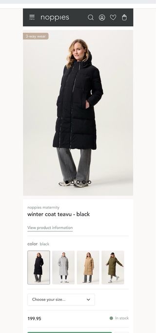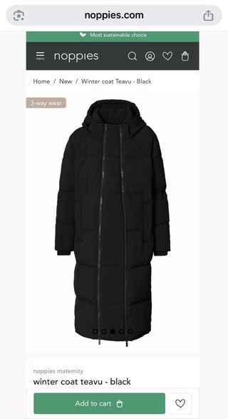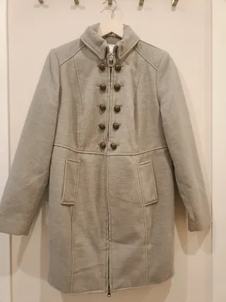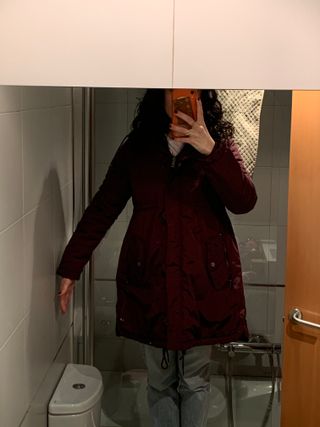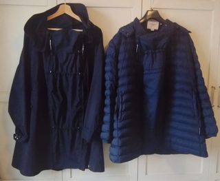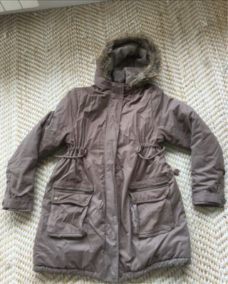 Abrigo de plumas premamá, comprado en Londres. Talla 34-36, pero es muy, muy generosa. Para que os hagáis una idea, yo tengo una L en abrigo de Zara y me va más ajustado que este, yo diría que es una 38 bien, hasta una 40. El relleno se puede quitar y se queda en parka de entretiempo, y también tengo el accesorio para porteo del bebé (está casi sin usar). Abrigo muy calentito, no pasé frío en todo el invierno y no tuve que preocuparme de si se me quedaba pequeño el abrigo normal. Luego pude usarla después porque se ajusta en la cintura. Cualquier duda podéis preguntar!