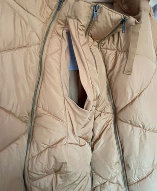 Abrigo midi acolchado con cuello elevado, capucha con ribete efecto pelo. Modelo de corte holgado con cordón de ajuste elástico oculto bajo el busto y bolsillos laterales con cremallera. Forrado. Ideal durante todo el embarazo para lo meses de frío. En perfecto estado. Medidas: Largo desde hombro hasta abajo: 75 cm De axila a axila: 52 cm Largo manga desde hombro: 60 cm