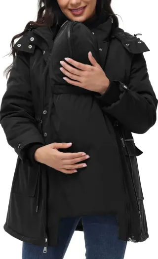 Abrigo diseñado para embarazo y porteo. - Capucha con pelo sintético. - Cierre de cremallera doble. - Cordones ajustables en cintura.