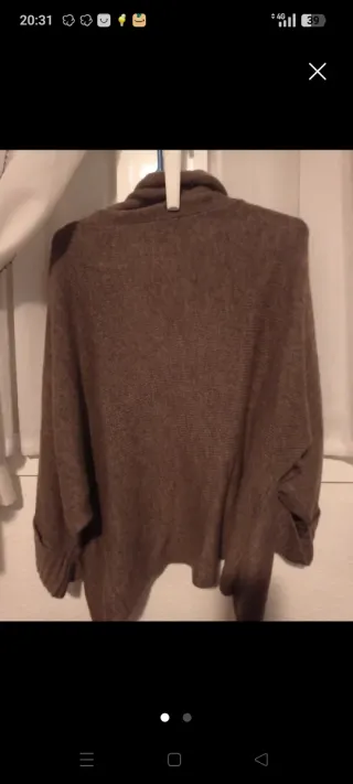 Conjunto de chaqueta y camisa en color marrón. La chaqueta tiene un diseño de punto grueso y cuello alto. - Tejido suave y cálido. - Mangas largas con puños. - Diseño tipo poncho o capa.