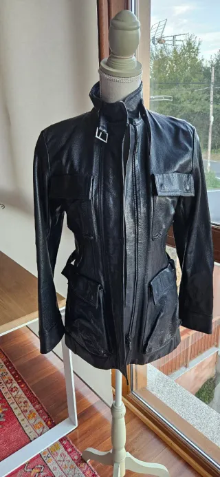 Chaqueta de piel de búfalo de la marca Purificación García. - Diseño con cuello alto y cierre de cremallera. - Bolsillos frontales con solapa. - Cinturón ajustable en la cintura. - Detalle de hebilla en el cuello. Está impecable.