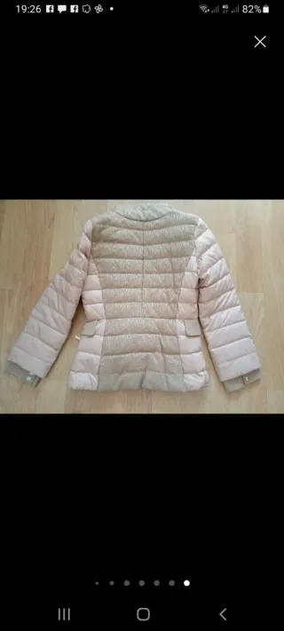 Chaqueta de plumas con un diseño moderno y elegante. -Sirve para talla XS y S - Cuello alto - Cintura elástica con detalle de ojales - Bolsillos delanteros con solapa de cuero - Cierre frontal