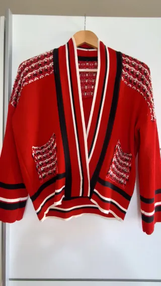 Chaqueta de punto con un diseño vibrante y detalles únicos. Talla 40, perfecto estado, poco uso, medidas largo 56cm y 58cm de sisa a sisa, roja y blanco, oportunidad. (15) - Tejido principal en rojo. - Adornos de punto en hombros y bolsillos con hilos blancos, negros y rojos. - Rayas decorativas en blanco, negro y rojo en puños y bajo. - Cuello abierto con solapas.