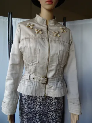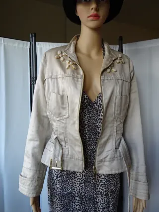 Elegante chaqueta de color beige con detalles decorativos. - Cierre de cremallera frontal. - Cinturón ajustable con hebilla dorada. - Adornos florales dorados en la parte superior. - Bolsillos frontales con solapa.