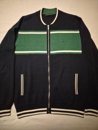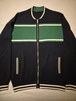 Chaqueta de punto de la marca Purificación García, con un diseño moderno y elegante. - Color azul marino con detalles en verde y blanco. - Cierre de cremallera. - Cuello redondo. - Puños y bajo con banda elástica.