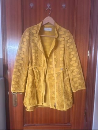 Chaqueta con un diseño original y llamativo. Totalmente nueva, no tiene uso! - Tejido con textura calada. - Detalle de cordón ajustable en cintura. - Cierre de cremallera frontal. - Bolsillos laterales. PRECIO NEGOCIABLE‼️ Para más información, DM📥